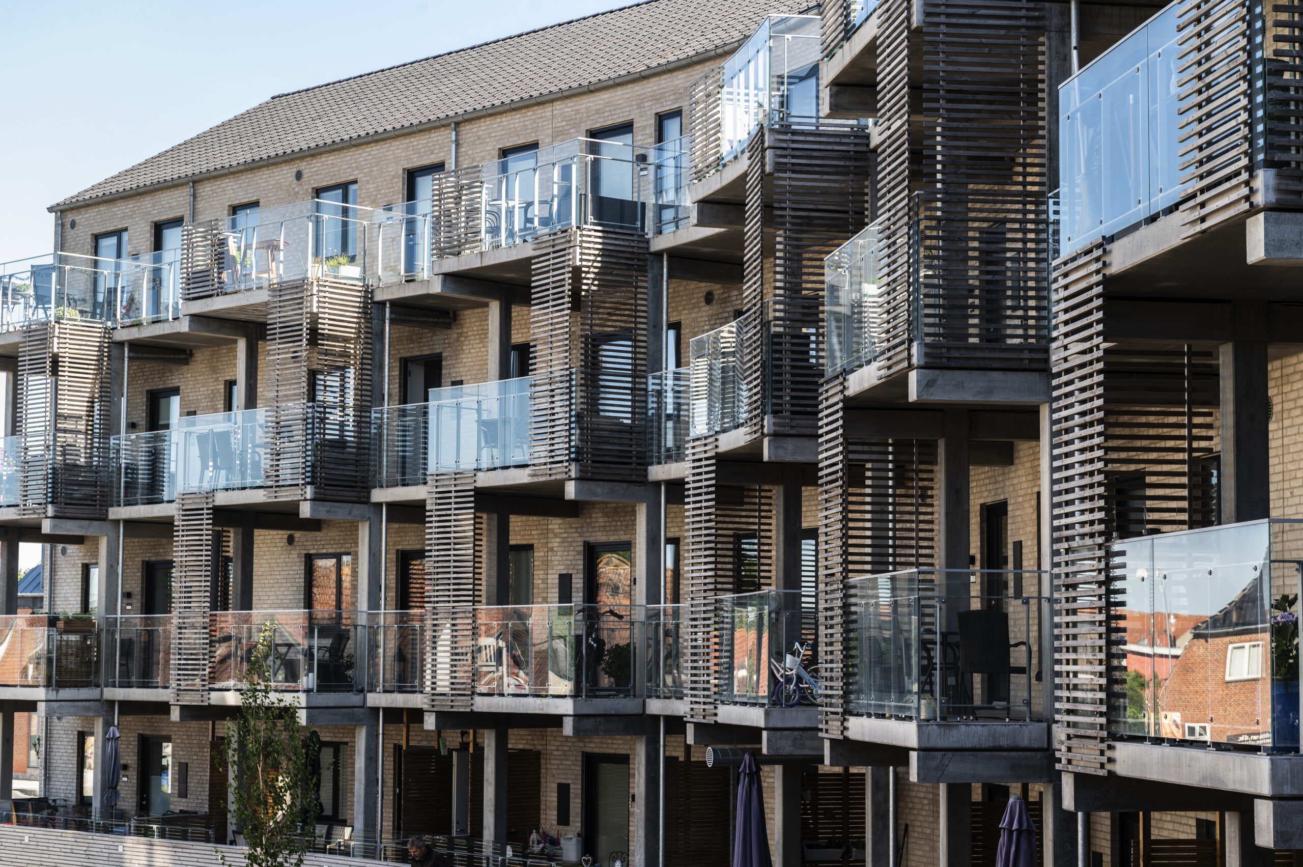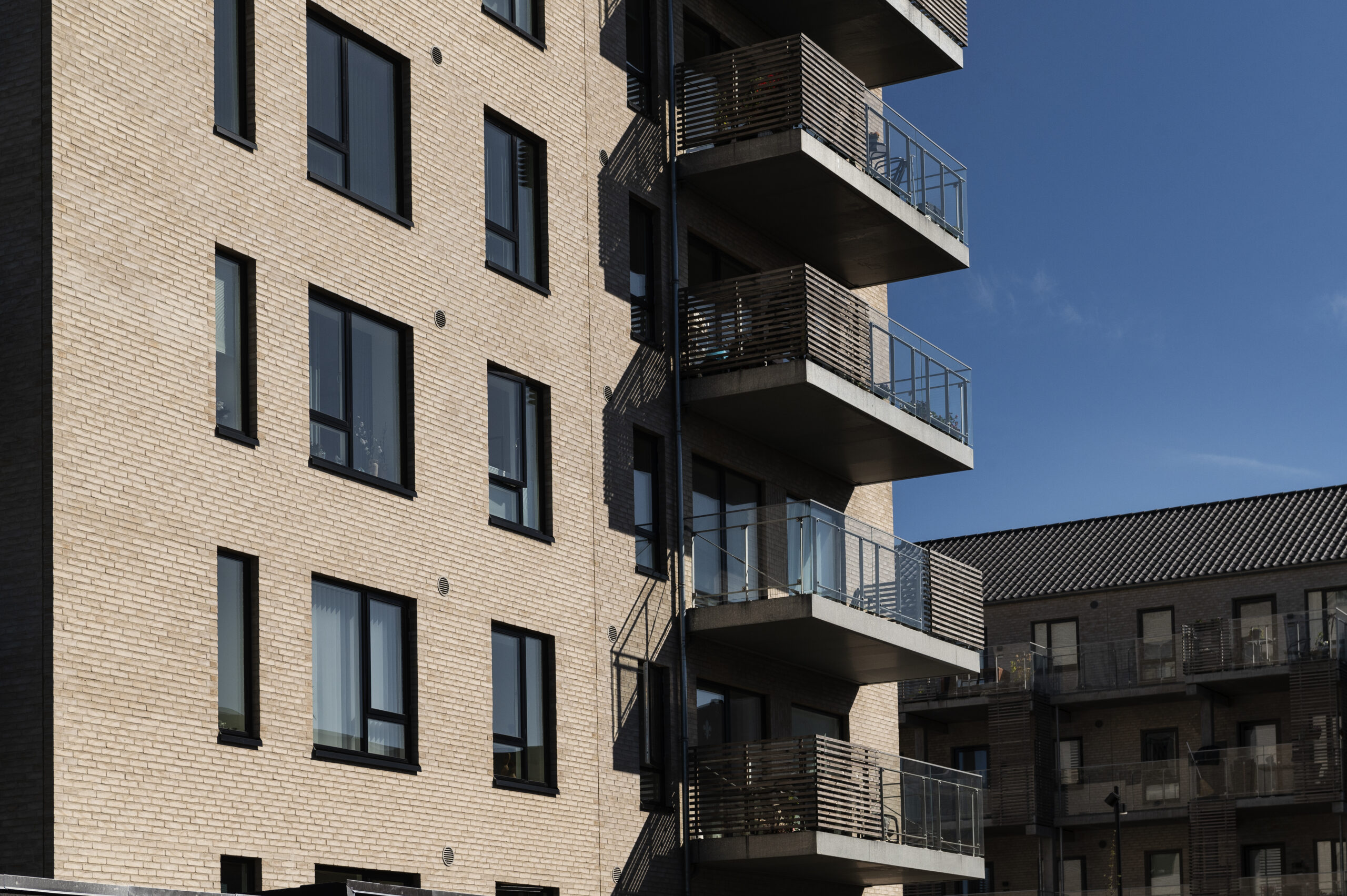 Blokkene er skalmuret med lyse sten, samt enten svalegange i beton eller store stålaltaner.
